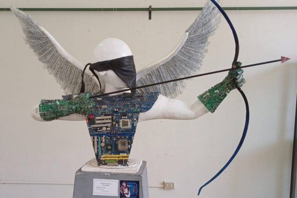 El profesional resaltó “El cazador”, pieza que muestra interacción entre las personas por medio del internet y el amor cibernético; por eso incluye un antifaz que simboliza estar ciego o vinculado cibernéticamente, no con lógica sino el corazón. “La palanca es una escultura de la mitología cristiana, son conocidos cómo los niños sagrarios y son seres híbridos entre ángeles y demonios que fueron creados para bajar al infierno y combatir, esta obra es con discos duros y material reciclado”, anotó.
